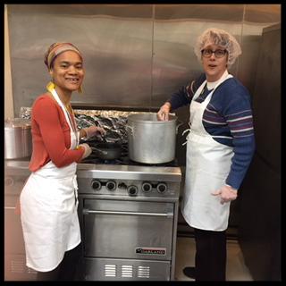 recipient of Manna services. Both discussed the places they were born, what their favorite food memory was, and what they used to eat when they were children. David bolstered up Jim's confidence in the kitchen by complimenting his knife skills, and soon both were trading off the vegetable preparation responsibility.
