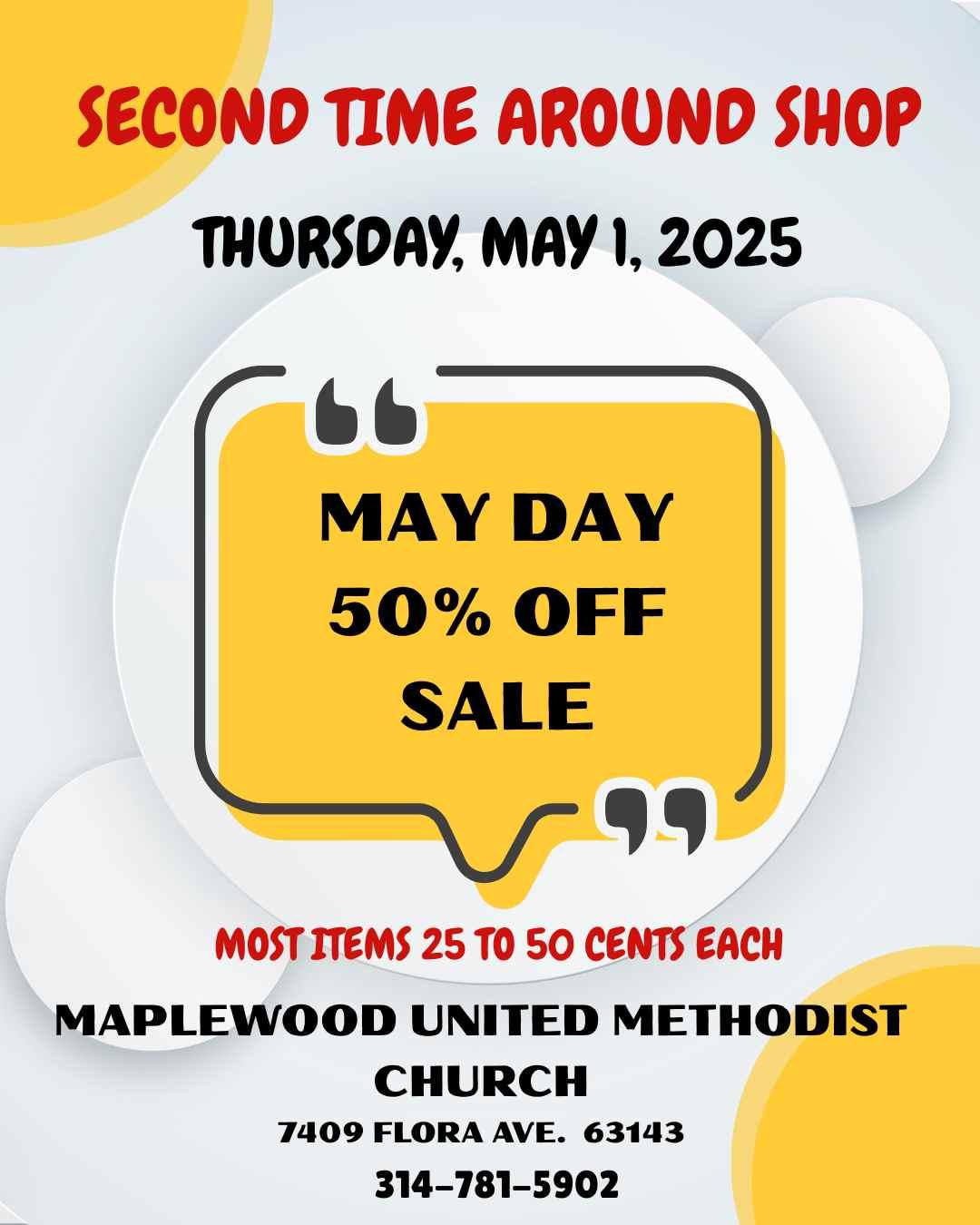 9:00 a.m.- 2:00 p.m. Second Time Around Shop - 50% off Sale