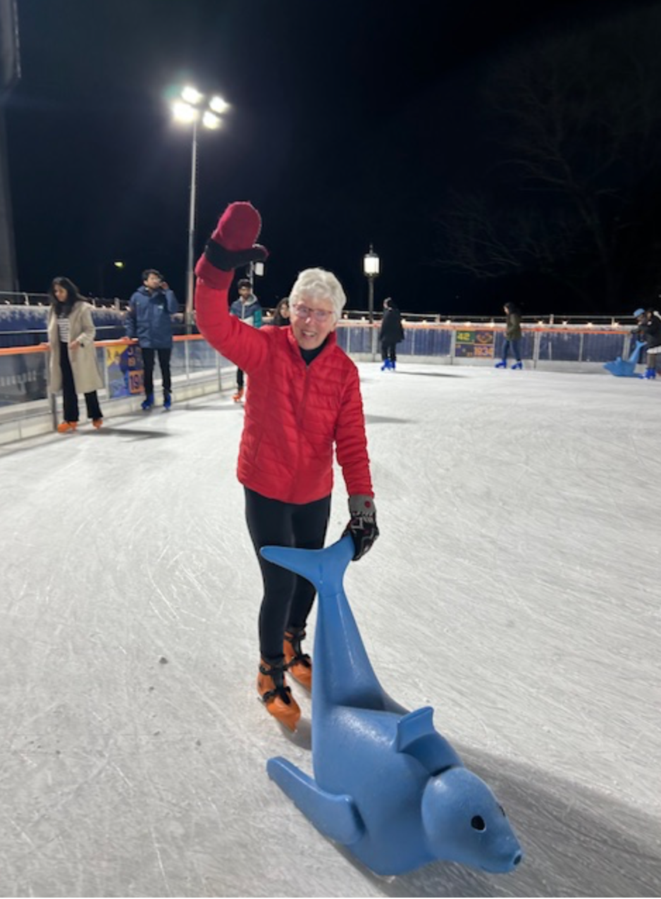 | | Thank You Johns Hopkins for sharing the Ice Rink with the community. Tuscany-Canterbury had a great time. | Pat Hawthorne skating at the rink and using one of the kiddie balancing prop | |