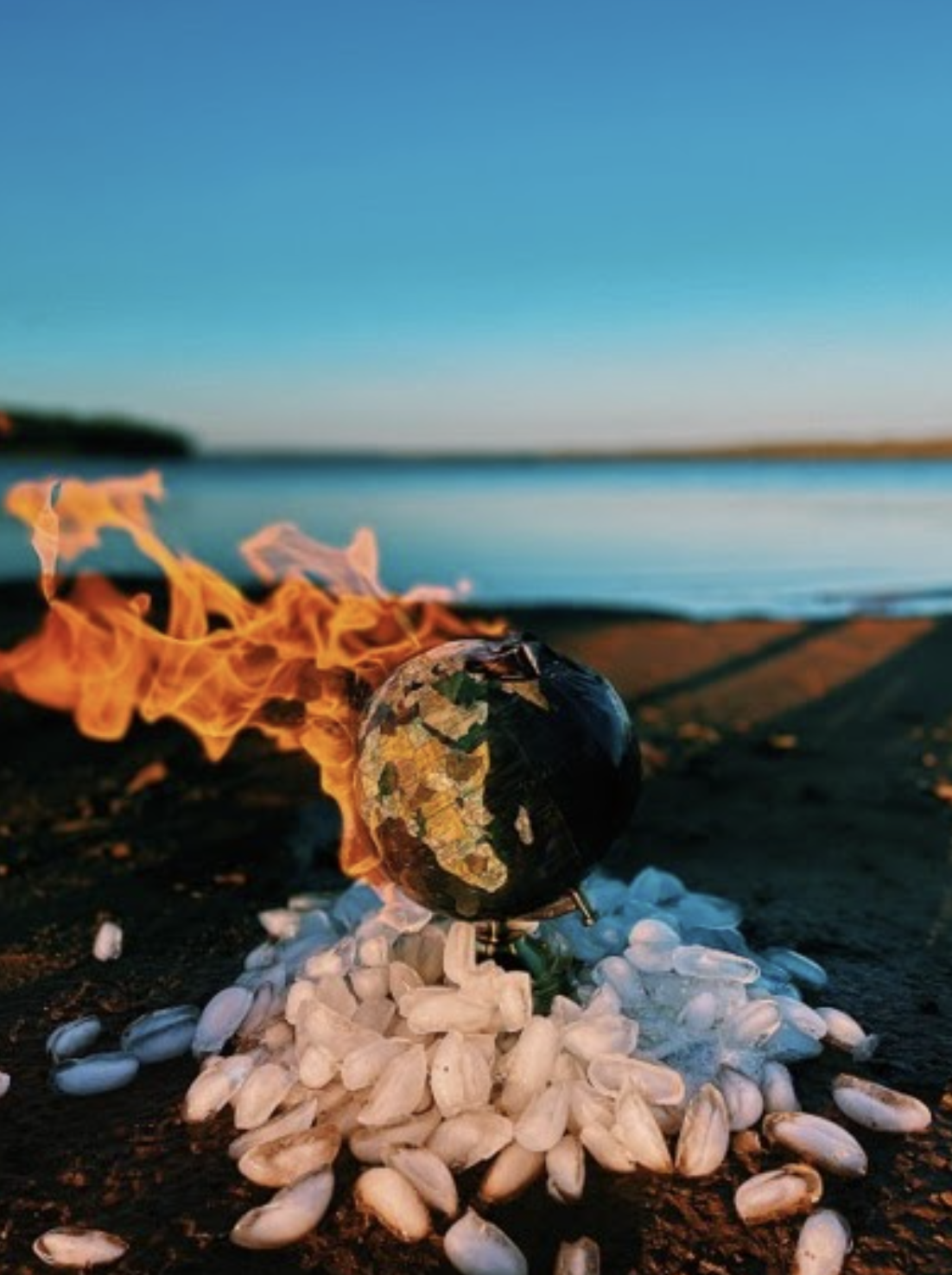 Pictured above: Asher Felty created his picture by lighting a globe on fire with a base of ice. The globe was a literal representation of the earth and the ice at the base represents the melting of the polar ice caps. The fire was a metaphor for human-caused wildfires and global warming.