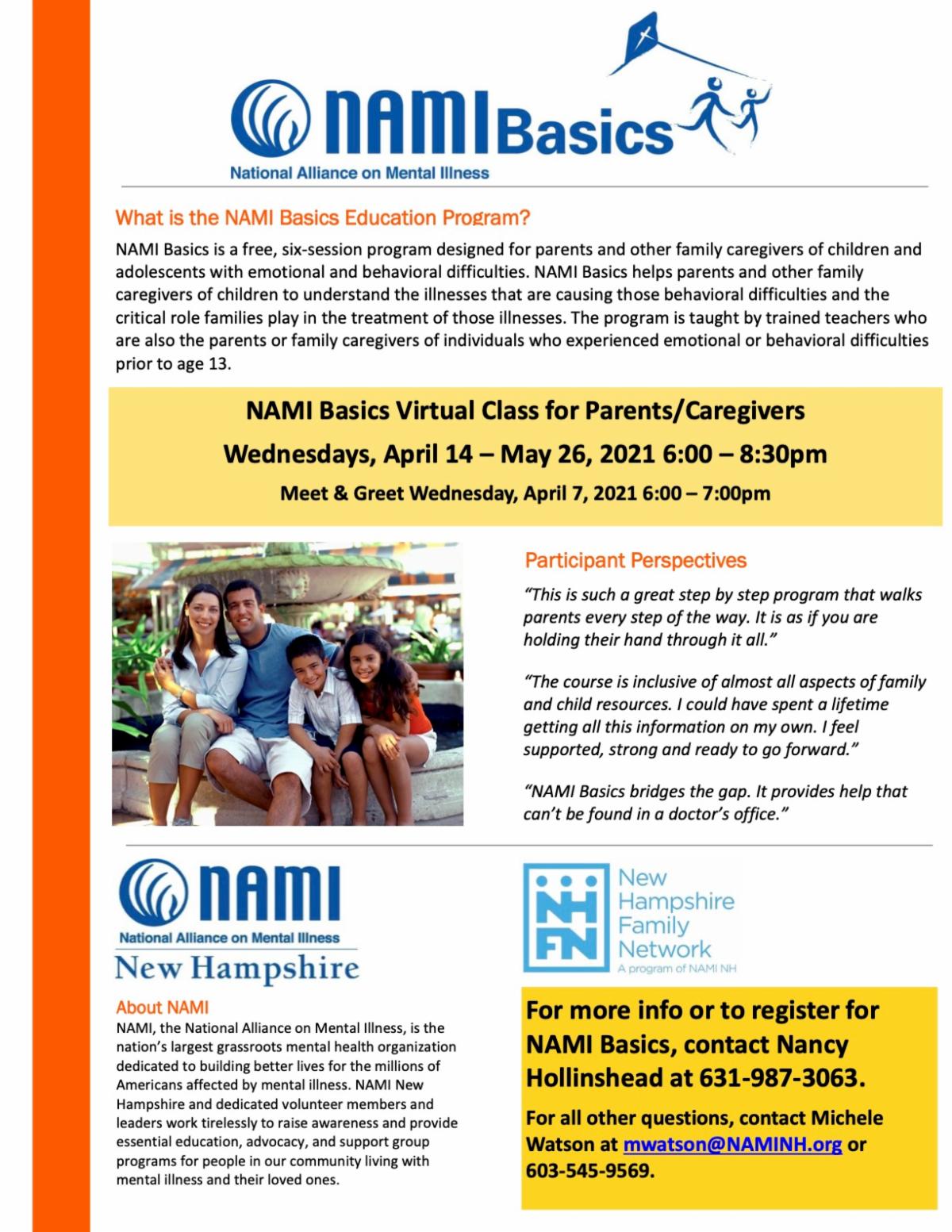 To reserve your spot in the NAMI Basics virtual session starting next month, contact Nancy Hollinshead at 631-987-3063.