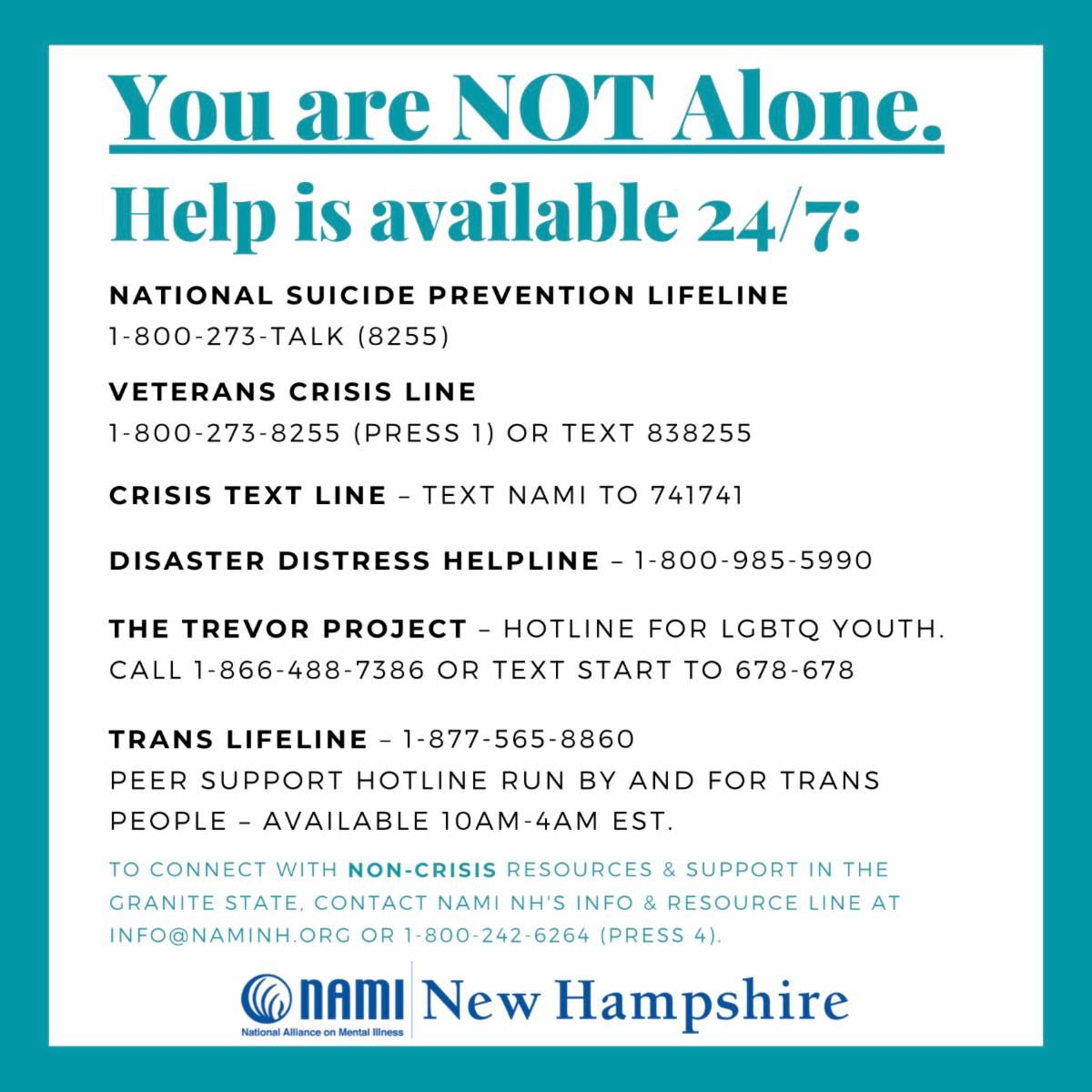 To connect with (non-crisis) resources & support in the Granite State, contact NAMI New Hampshire's Info & Resource Line at 1-800-242-6264 (press 4) or info@NAMINH.org, or call 211.