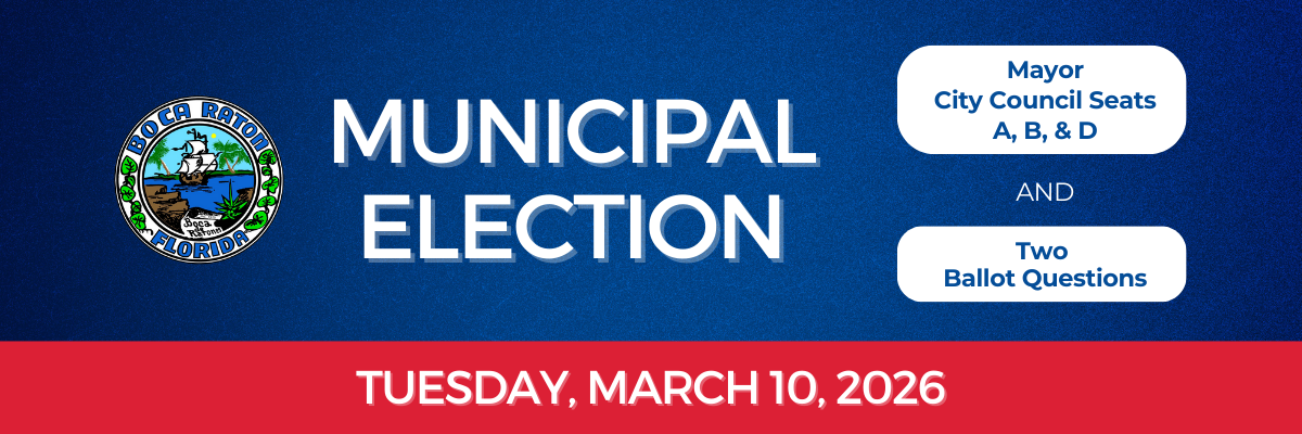 The next regularly scheduled Municipal Election for the City of Boca Raton will take place on Tuesday, March 10, 2026. The ballot will contain candidates for the City Council positions of Mayor, Seat A, Seat B, and Seat D, as well as two ballot questions.