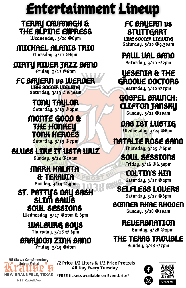 NEW BRAUNFELS: Walburg Boys at Krause’s Cafe, 6 p.m.