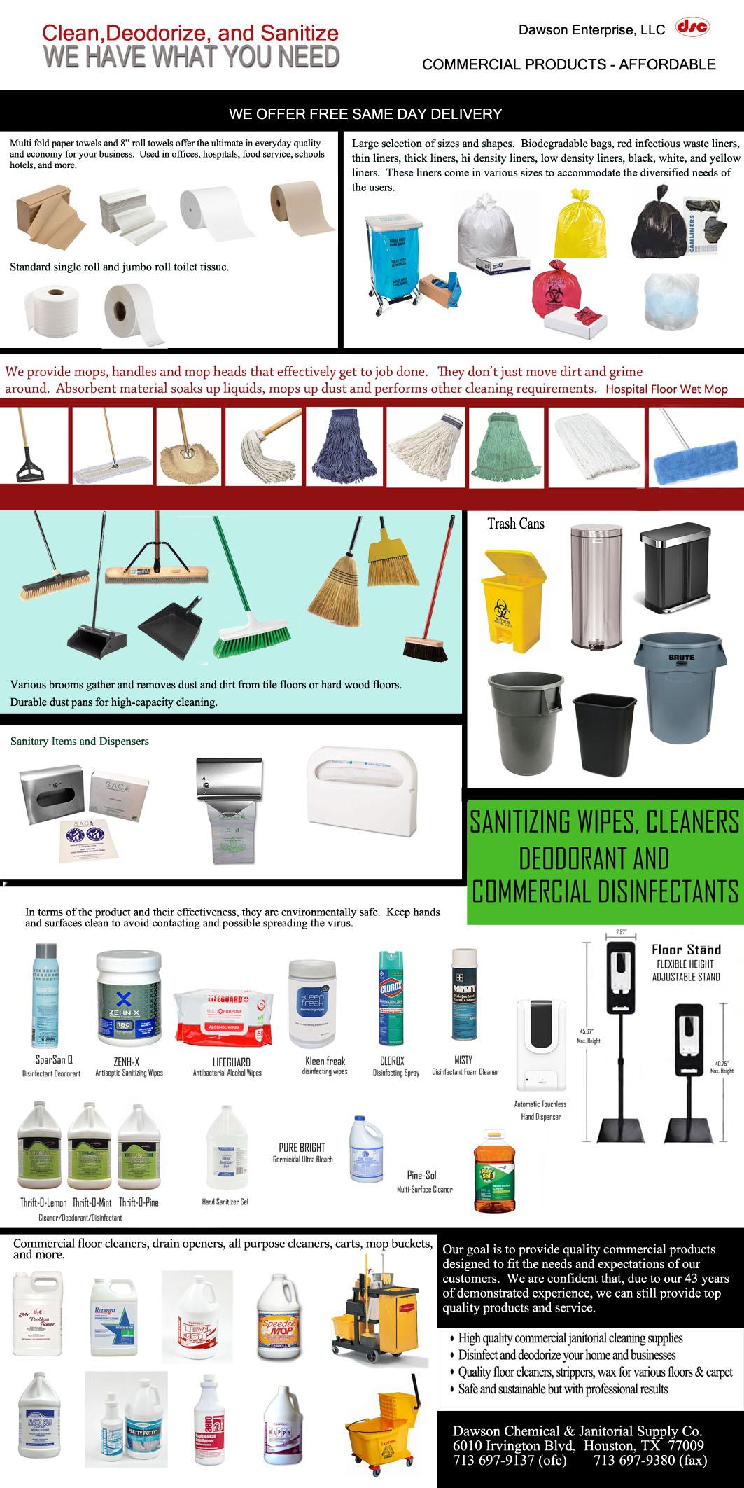 Dawson Chemical & Janitorial Supply Company in the Greater Northside has been serving Houston and surrounding areas for over 41 years. They have one of the largest janitorial inventory supply, which allows them to provide immediate service to their customers.