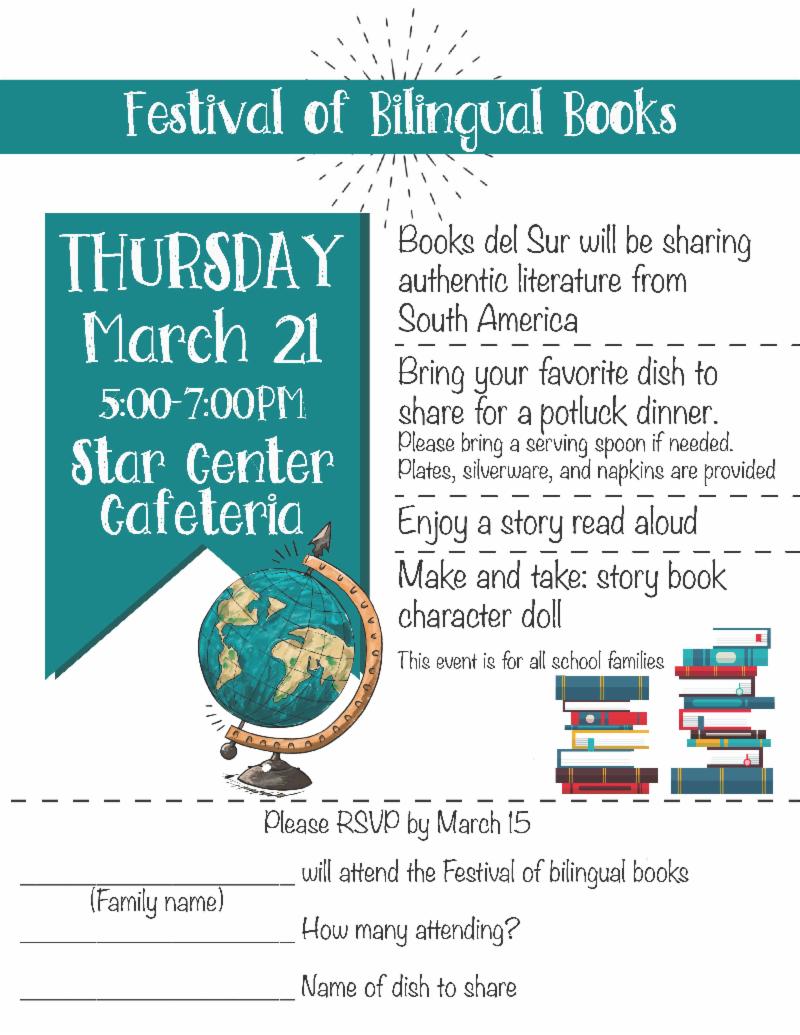 - Star Center Bilingual Family Reading Night, 5:00-7:00pm