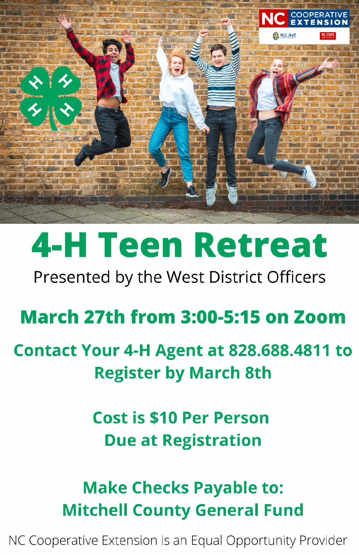 We will be holding this event on Saturday, March 27th from 3:00-5:15 via Zoom for ages 13-18. Currently, we are asking that all 4-Hers pay a small registration fee of $10. This will help us to offset the cost of purchasing some supplies needed for a fun and memorable activity we have planned. In planning meetings we were able to discuss what makes a good Teen Retreat and one of the things that we decided on was the feeling of togetherness. Although we will only be together via Zoom, we have worked hard to plan a Teen Retreat that captures that same feeling of togetherness without actually being together. I don't want to spoil anything but I will say that this year's Teen Retreat will be one for the books!