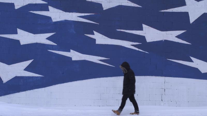 Image Description: In this still image from the film North By Current, a person wearing a hooded winter coat and winter boots walks through snow. Behind them is a brick wall painted with a mural showing large white stars stretched against a blue background, a detail of the U.S. flag. (Learn more about image descriptions)