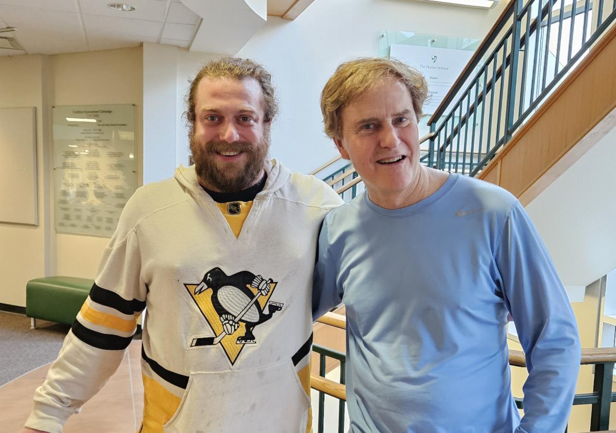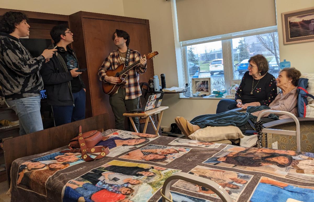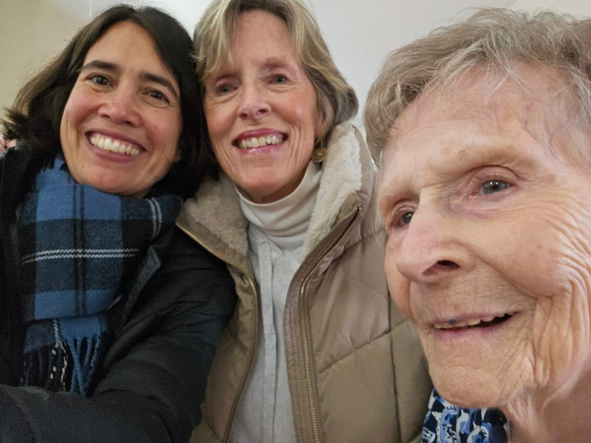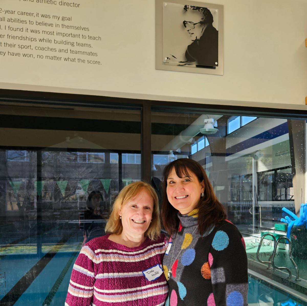 Debbie Ginsburg Hoff '83 and Deb Weiss Walker '83 (Director of Development 2012-2017) stopped to pose under a picture of Bob Joslyn P '80, '83 (Physical Education, 1969-1996), dad to their classmate Laura '83. | Former faculty member, Linda Epstein (Lower School Student Support, 2016-2020) and Janet '08 recently lost a loved one. Corky Epstein, Linda's mother, passed away. Sybil Prince '00, P '37 (Hospice Educator 2007-present) coordinated a visit from three Harley students (Dom DiFrancesco '24, Wyatt Pinto '24, and Will Fiandach '24) to sing to Corky while she was in hospice. | |