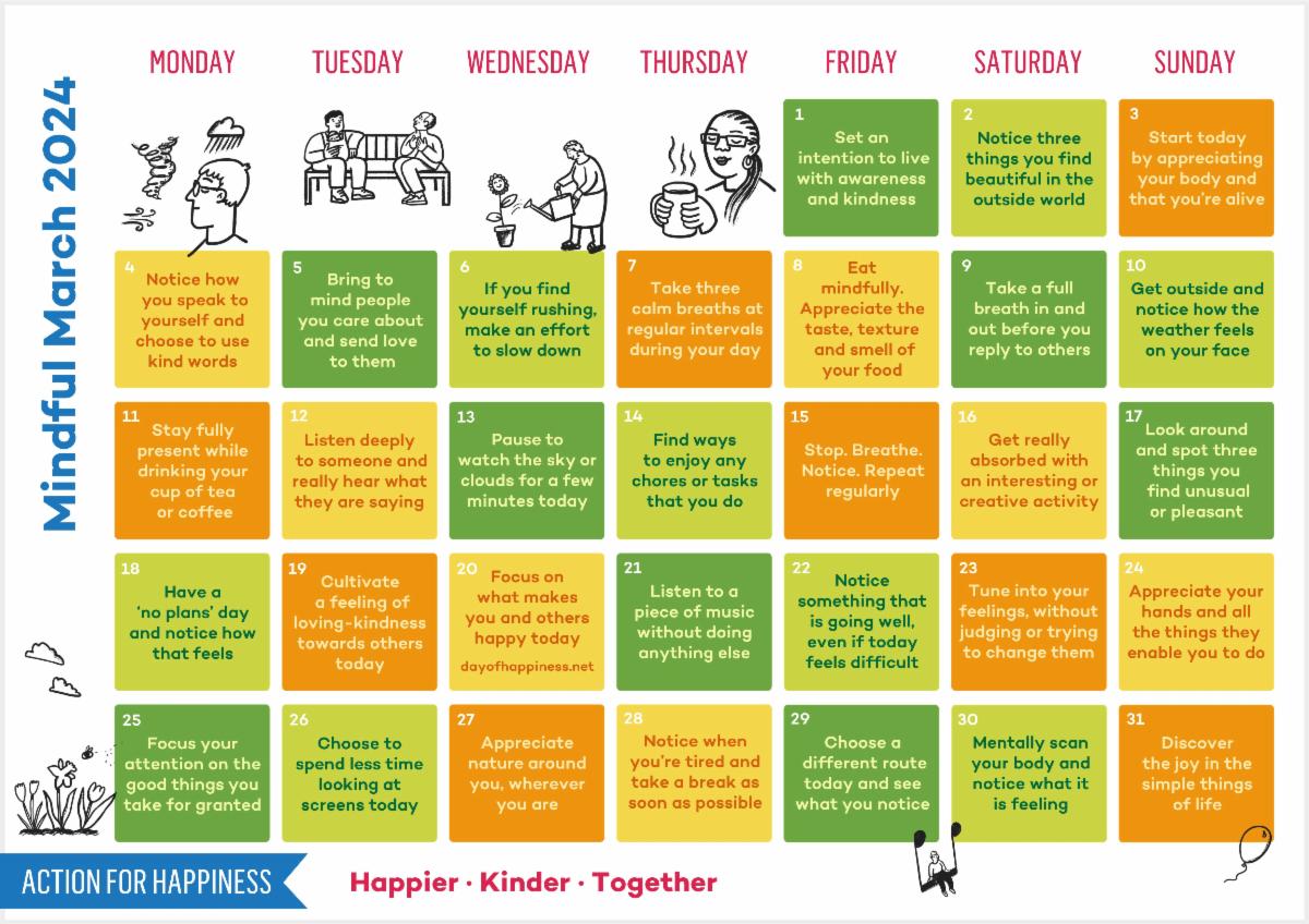 Visit https://actionforhappiness.org/ to access the Mindful March calendar and explore additional resources for enhancing your well-being. Let's make March a month of mindfulness and self-care!
