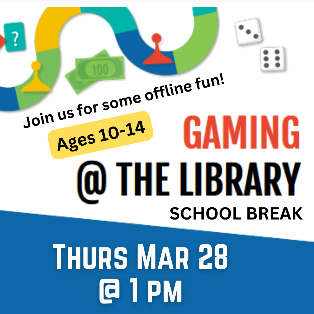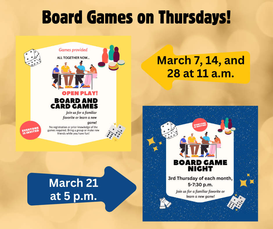 Join us in the Reference Department to play old favorites or learn something new. Bring a group or come alone and make new friends. Games are appropriate for ages 7 and up, so families are welcome!