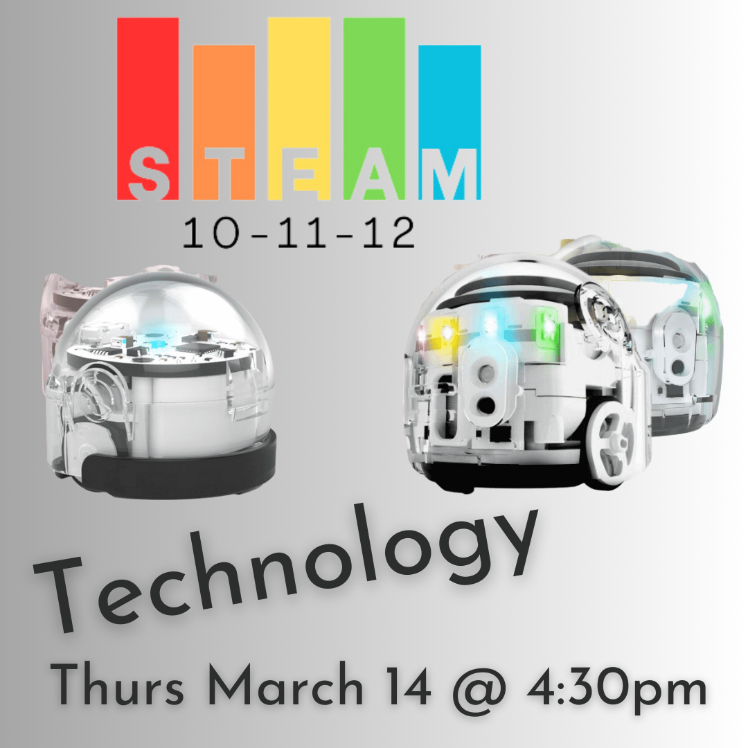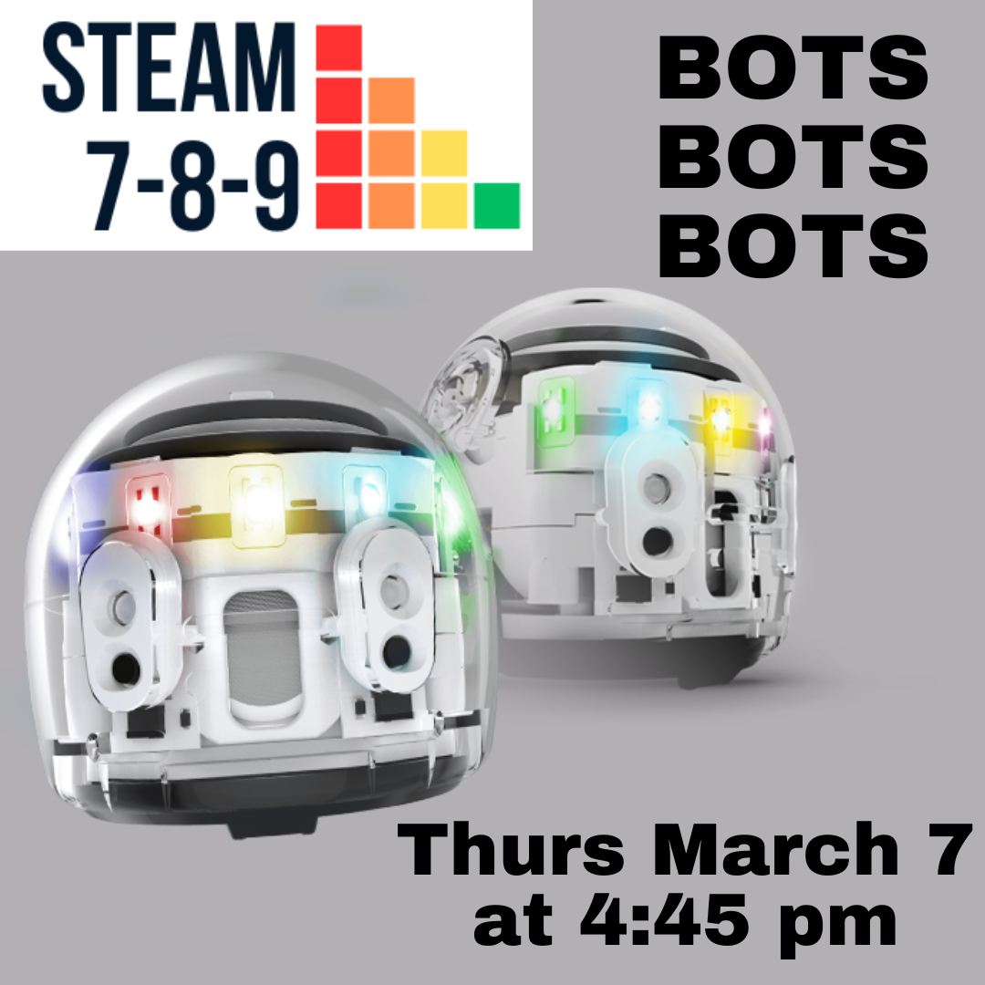 BOTS, BOTS, BOTS! Learn color codeing with OzoBots. There will be free time to explore with our cornucopia of robots: BeeBots, Cubelets and more with Ozobots.