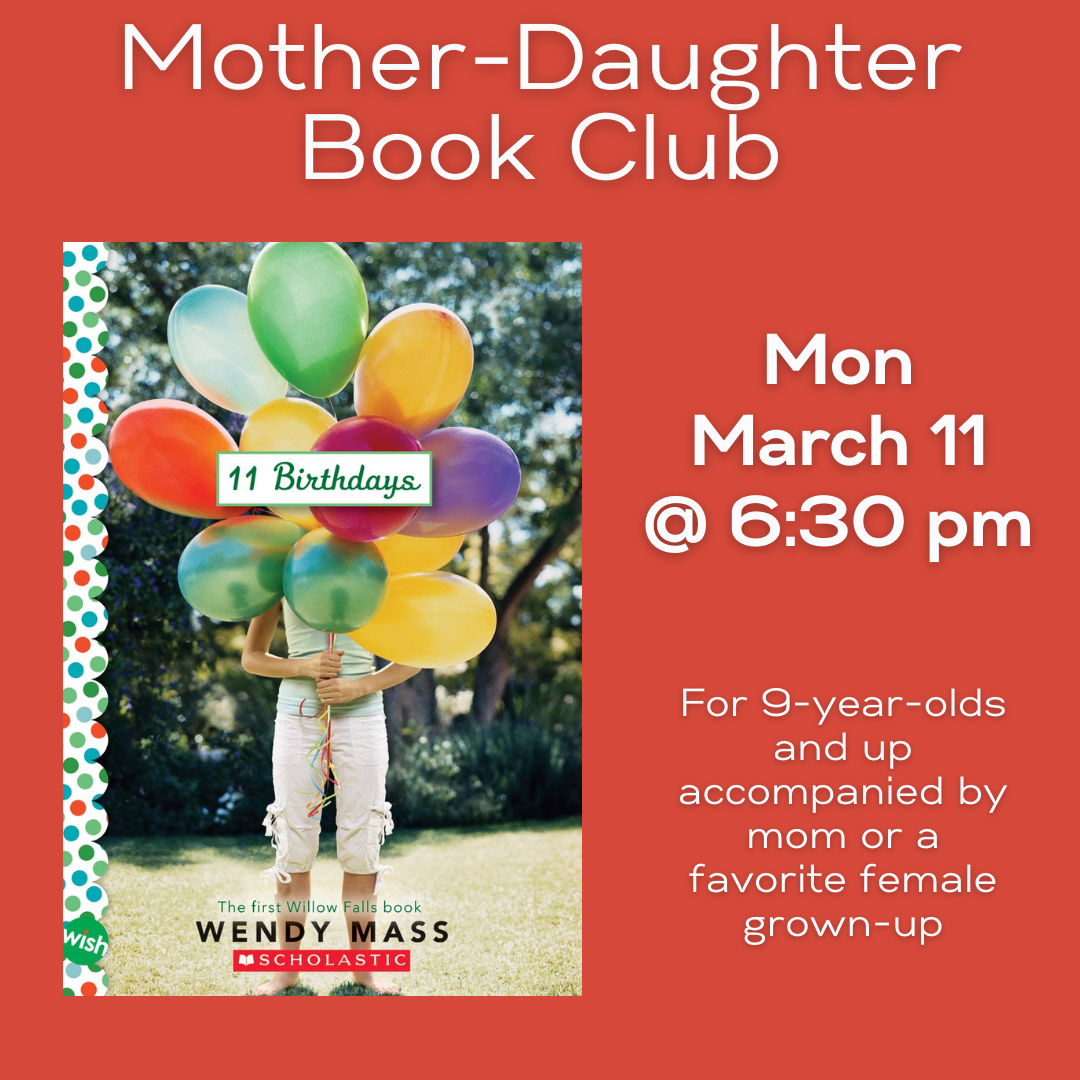 This in-person book club is for 9-year-olds and up accompanied by mom or a favorite female grown-up. Join us for book discussion, an activity and snacks. For this month's meeting, please read 11 Birthdays by Wendy Mass.