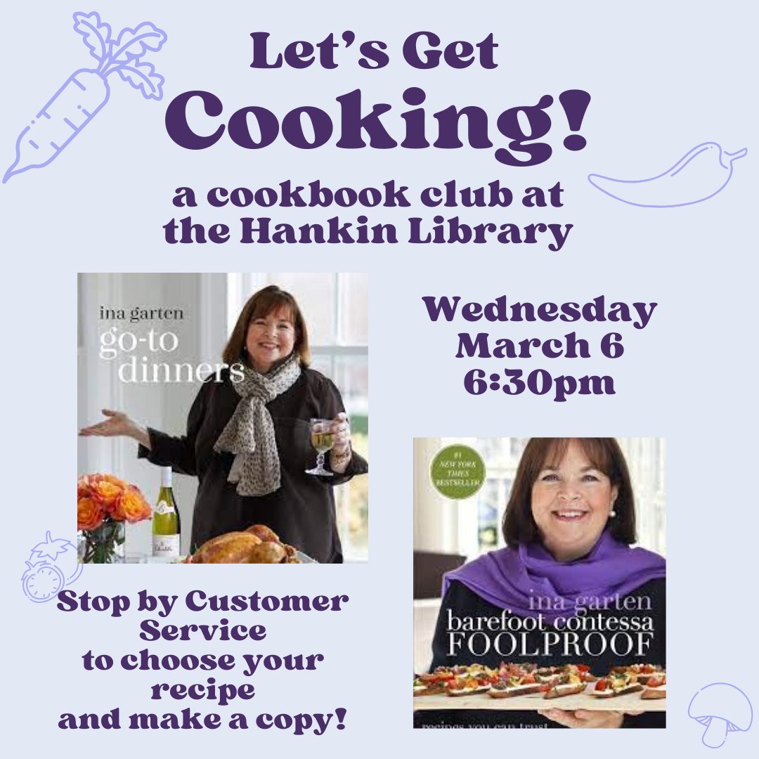 Let's Get Cooking features a special cookbook from our collection. Stop by the Reference Desk to browse this month's cookbook. Choose a recipe, receive a photocopy and make that dish to bring to the meeting.