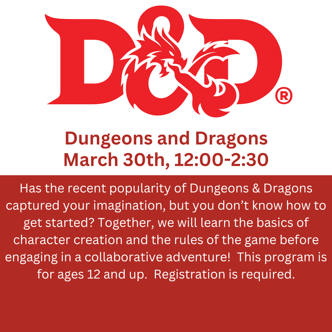 Has the recent popularity of Dungeons and Dragons captured your imagination, but you don't know how to get started? Together we will learn the basics of character creation and the rules of the game. Your new characters will engage in a collaborative environment adventure where you will utilize creative thinking and collective problem solving.