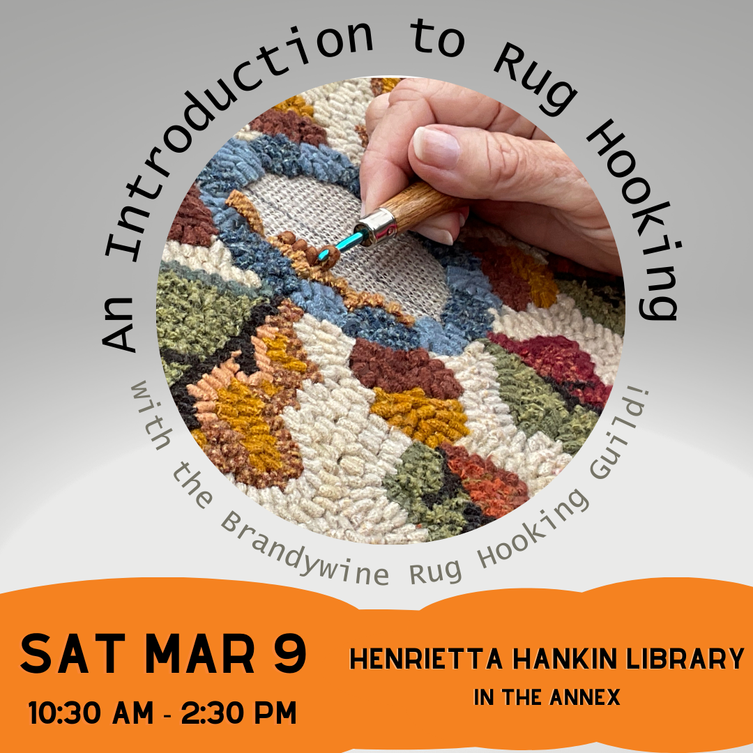 Get Hooked! Join us for a special day of hands-on hooking! From 10:30 am to 2:30 pm, the Brandywine Rug Hooking Guild will introduce you to the equipment and materials we use to create our rugs. Register here.