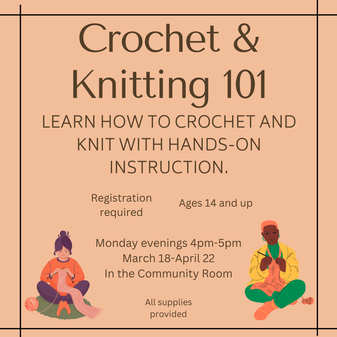 Join us at the library for a six-week hands-on instructional crochet and knitting course! This program is designed for beginners but all are welcome to join in on the fun. Click dates to learn more and register: