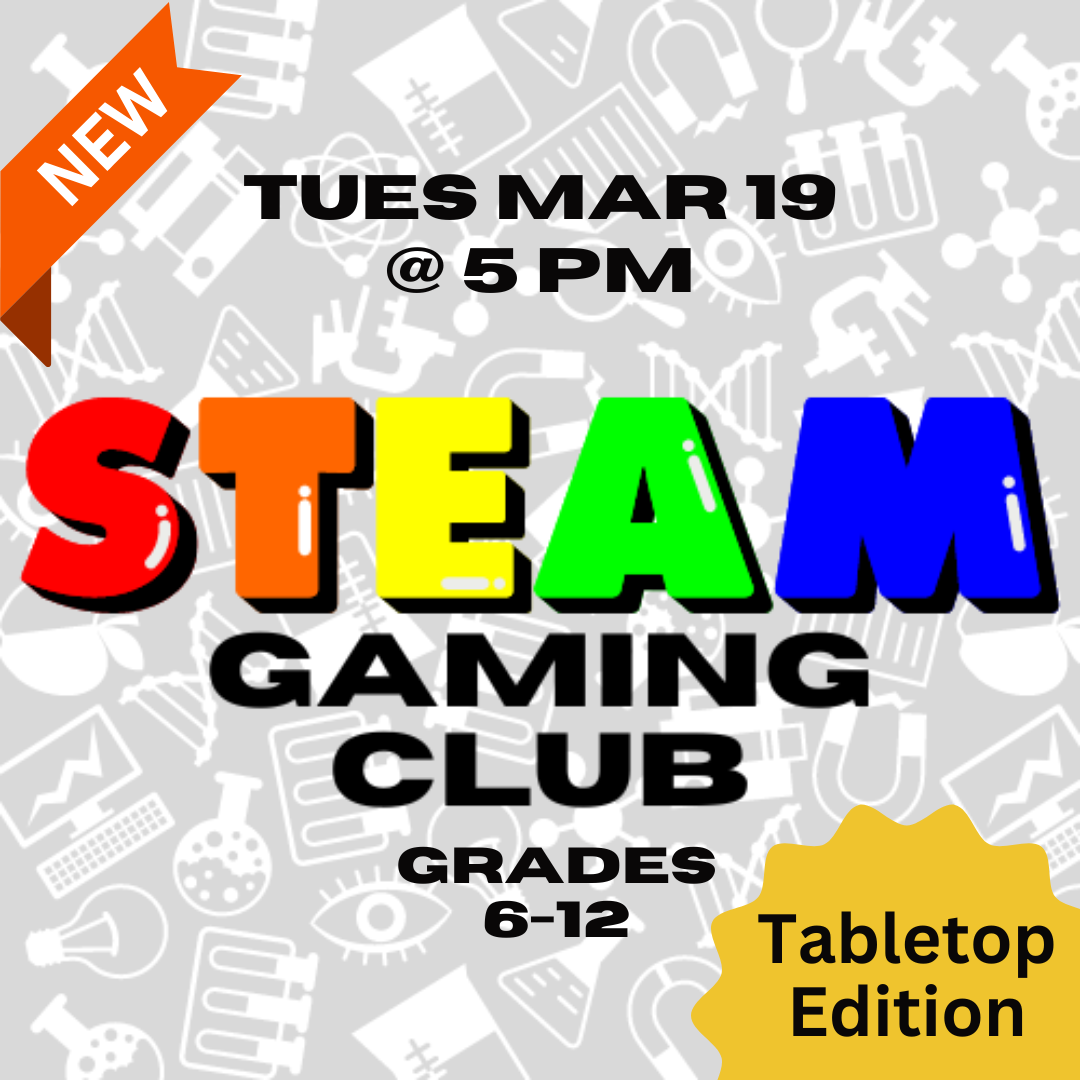 Join us at the library for this new Table Top Gaming program. There will be a variety of board and card game options. Tight on time? Pack a snack or a cold dinner. For students in Grades 6-12.