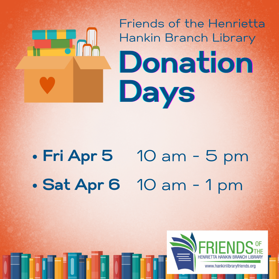 The Book Nook is open during library hours and is refreshed on a regular basis. All proceeds support the Henrietta Hankin Branch Library! For more information and to become a Friend, visit hankinlibraryfriends.org.