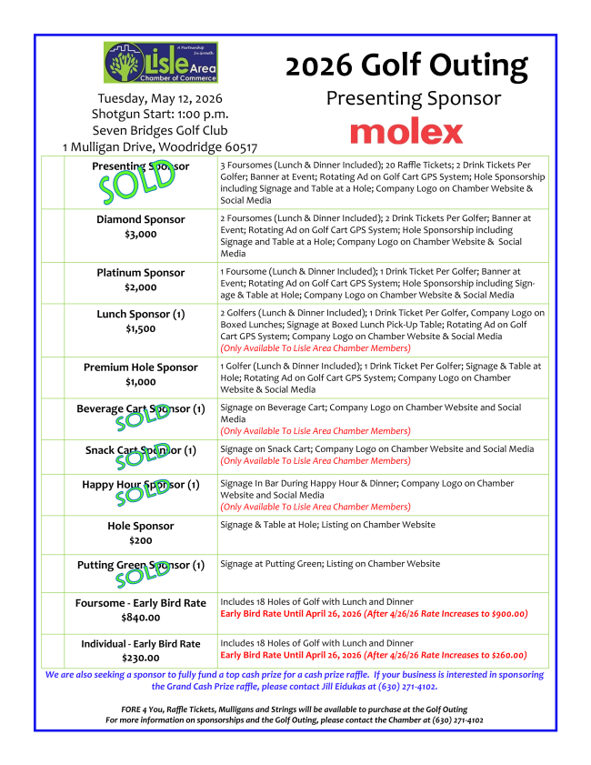 We would like to encourage everybody to participate in our events and committees. All are a networking opportunity and a chance to meet other business professionals and spread the word about your business. We should also remember the importance of supporting our local businesses. We have many great shops, services and restaurants in the Lisle area and the members on the Chamber website are a great place to start your search.