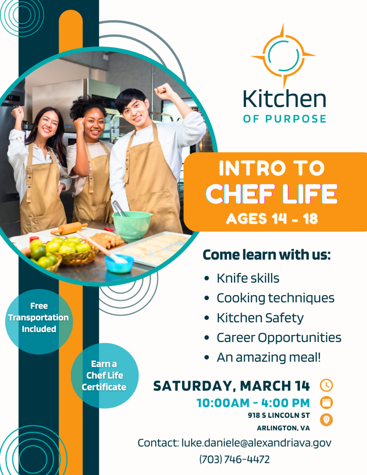 Come spend the day learning from culinary professionals and building skills you can use for life. Contact Luke Daniele at luke.daniele@alexandriava.gov to learn more.
