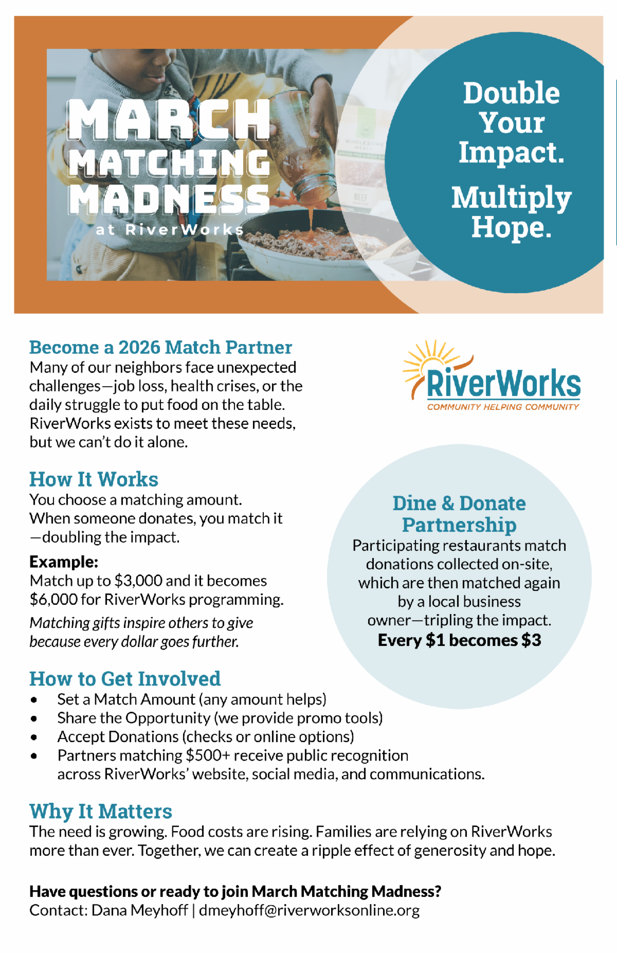 We admire all the dedicated organizations like the Chamber, Thousand Hearts, Lions, Churches in the community, RiverWorks, etc....and most importantly all the amazing people that dedicate so much of their time!