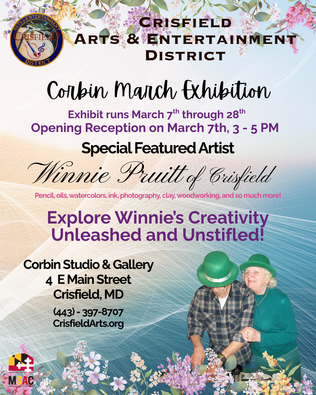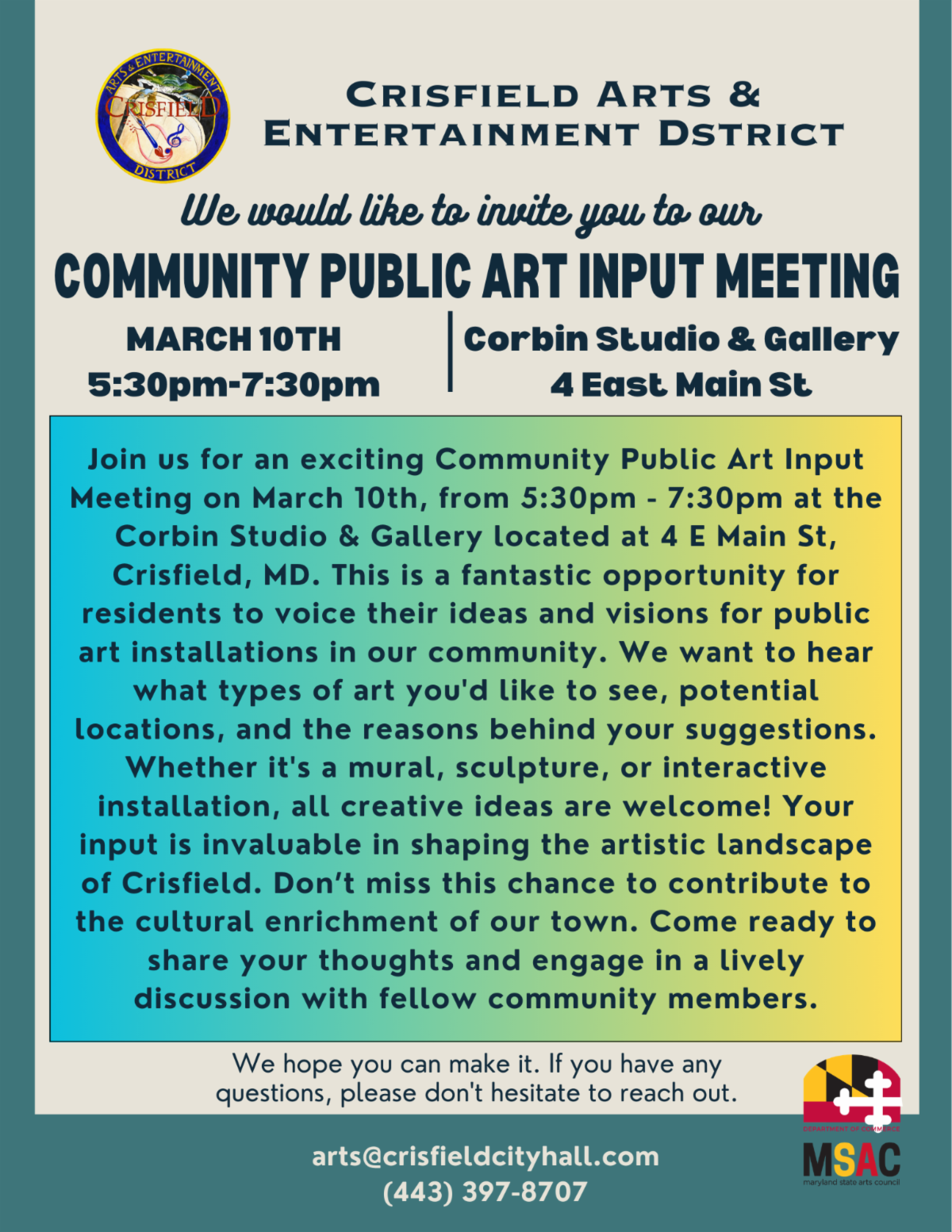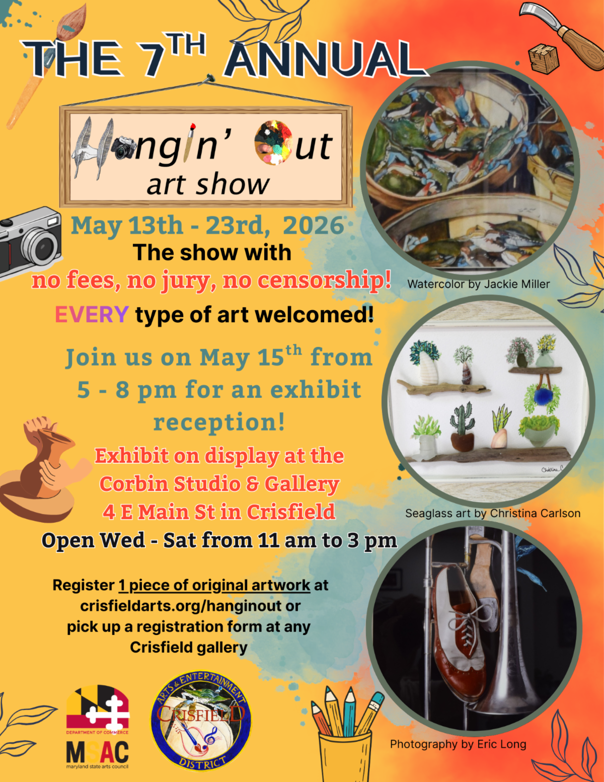 Always more events pop up! Bookmark the calendar to keep updated for things to do in the Arts and Entertainment District and the Crisfield community! Go to: CrisfieldArts.org