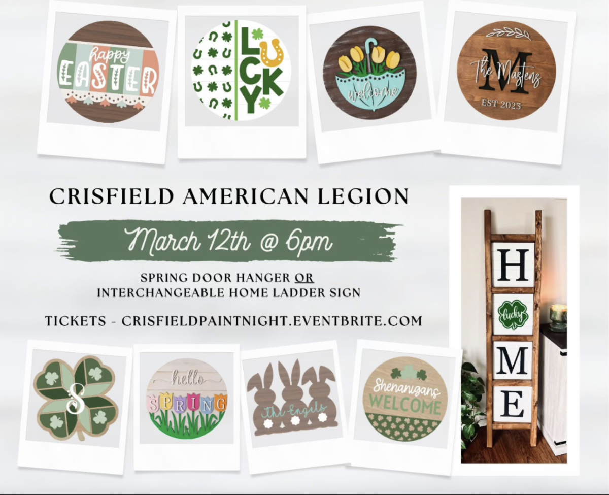 Join us at the Crisfield American Legion on March 12th at 6:00 PM for a fun-filled evening of creativity and relaxation!