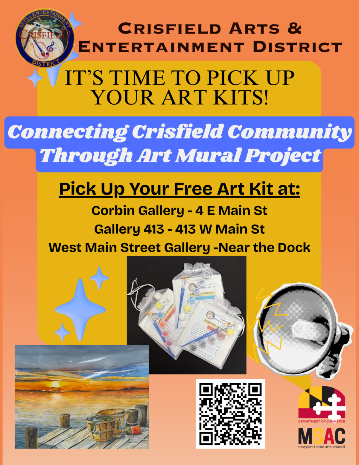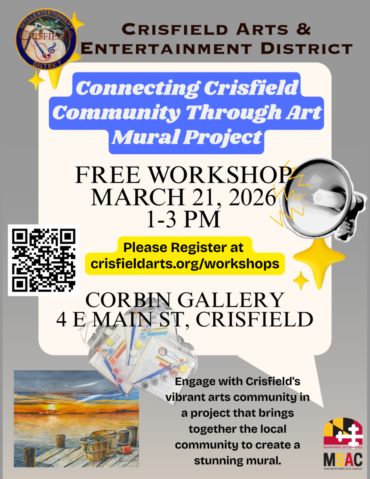 Join the Connecting Crisfield Through Art workshop to help create a collaborative mural celebrating Crisfield’s culture. All participants receive an art kit to paint their artwork, guided by local artists. Using a special process, a ceramic tile with each image created will become part of an 8’ x 12’ mural featuring a sunset, dock, water, and crabs in a basket.