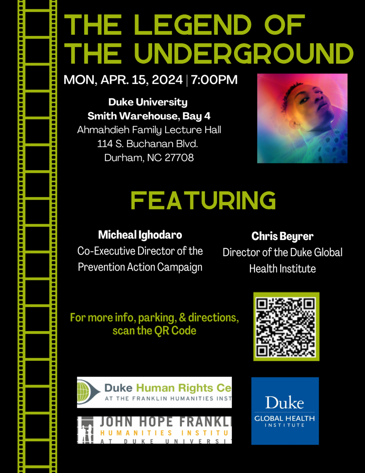 Exposing the punitive laws in Nigeria that have put an already beleaguered community at increased risk of extortion and violence, the documentary "The Legend of the Underground" follows a group of young, non-conforming Nigerians who have created safe houses in Lagos and Harlem. The film toggles between the two cities as daily threats endanger the health and safety of a community united across continents. Please join us for a post-screening discussion with Micheal Ighodaro, LGBTQI advocate and global human rights champion featured in "The Legend of the Underground." He will be in conversation with Dr. Chris Beyrer, Director of the Duke Global Health Institute. | |
