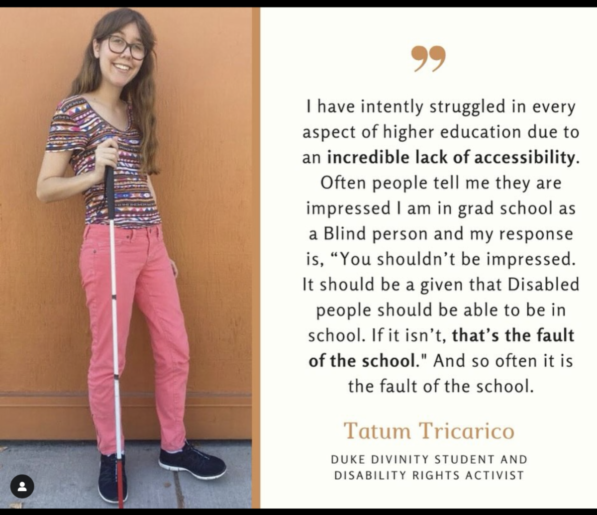 Tatum Tricarico is a student at Duke Divinity and a Disability rights activist on Instagram (@blind_person_in_area) where she shares her Disability Culture Calendar. Tatum is an author who writes on Disability History, Justice, and Culture, and the ways that they intersect with the Church and theology.