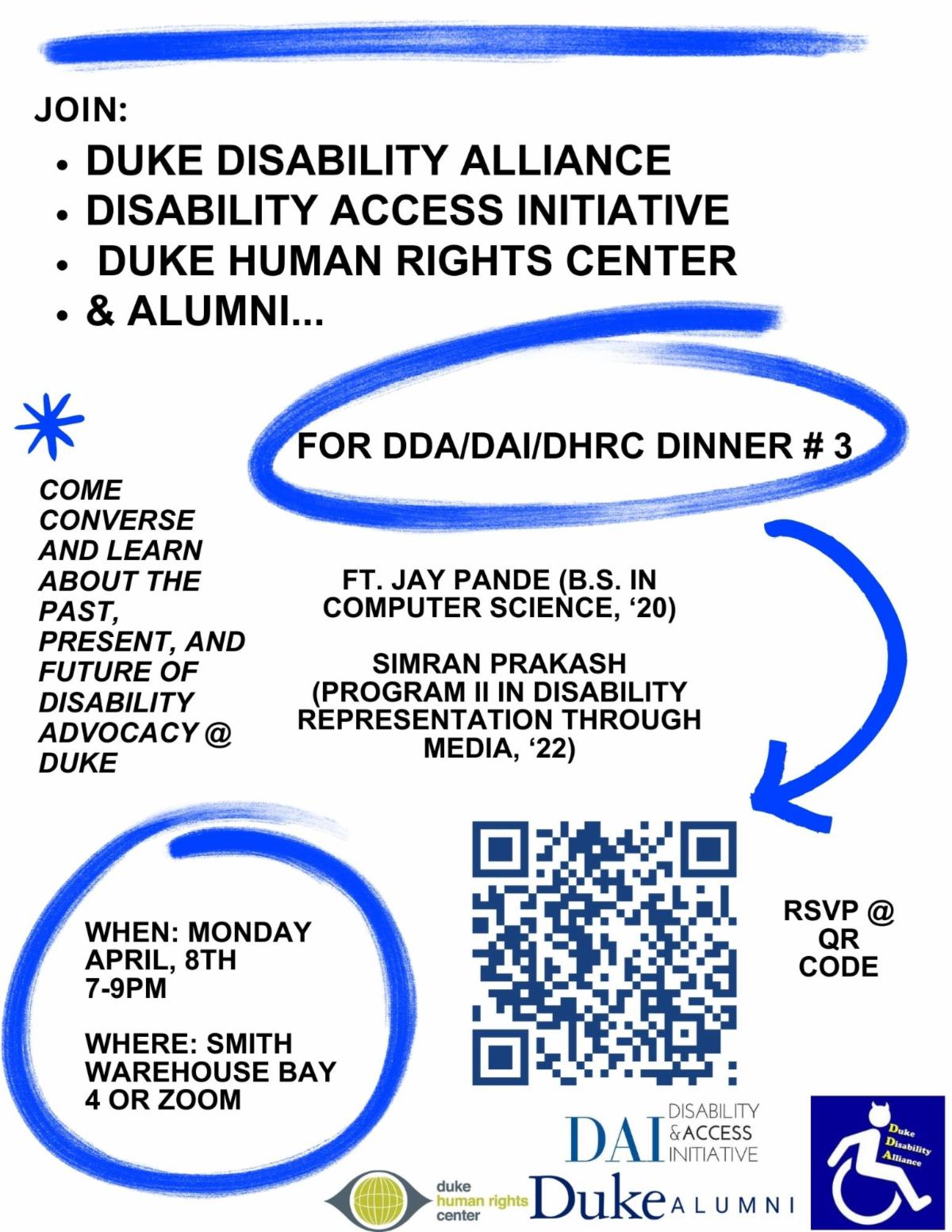 This Monday, April 8, from 7 to 9 p.m., the DDA, partners and alumni are cordially invited to discuss the challenges of disability rights advocacy at Duke. We look forward to this meeting!