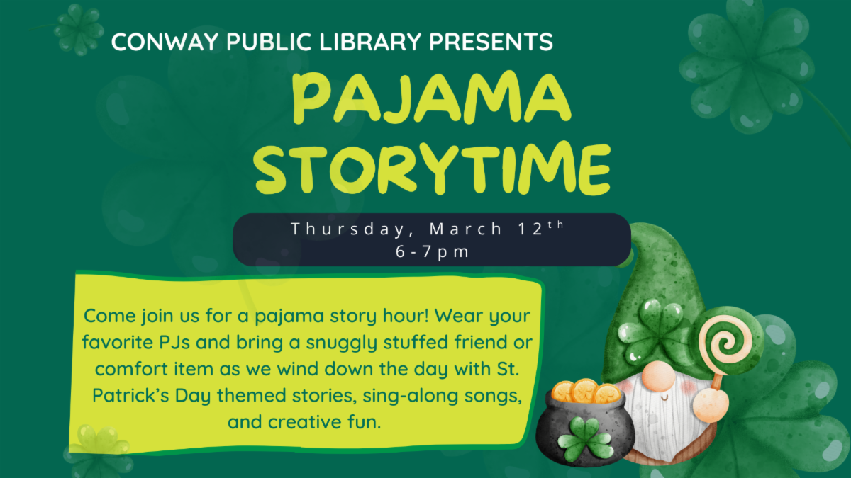 Join us for a theme-inspired story hour on March 12th at 6:00 PM in the Ham Room. Please come dressed in your favorite pajamas and bring your favorite cuddly stuffed animal or comfort item. Together, we wind down the day with seasonal-themed stories, sing-along songs, and creative fun. It’s the perfect way to end your day with a little magic and a lot of imagination!