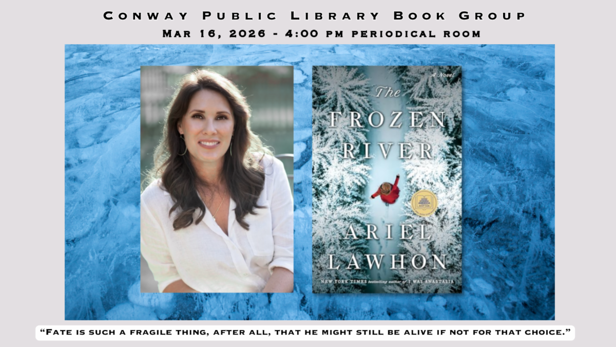 The book group meets on the third Monday of each month in the Periodical Room, except on holidays. For March, the selection is "The Frozen River" by Ariel Lawhon.