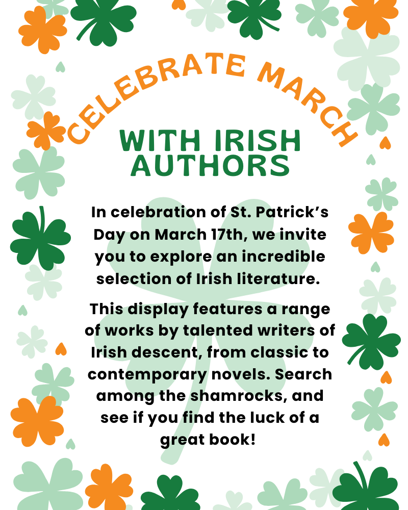 This display features a range of works by talented writers of Irish descent, from classic to contemporary novels. Search among the shamrocks, and see if you find the luck of a great book!