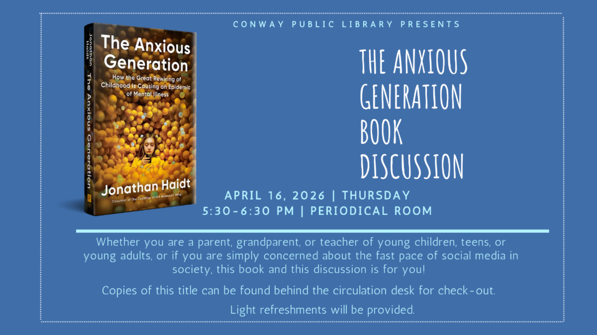 We invite you to join the Conway Public Library staff on Thursday, April 16, at 5:30 PM in the Periodical Room for a thoughtful discussion of "The Anxious Generation: How the Great Rewiring of Childhood Is Causing an Epidemic of Mental Illness" by Jonathan Haidt.