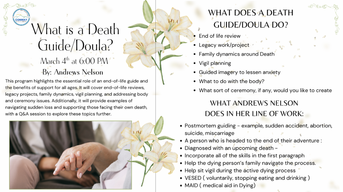 Additionally, the program will provide examples of navigating challenging situations such as sudden loss and support for those who are facing their own death. There will be an opportunity to ask questions afterward to explore these critical subjects further.