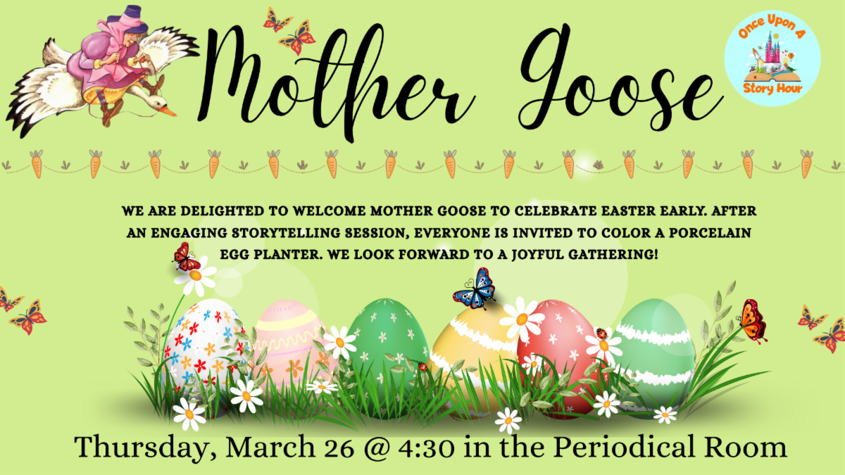 We are pleased to extend an invitation to join us for an early Easter celebration with the esteemed Mother Goose. Following an engaging storytelling session, attendees will have the opportunity to participate in decorating a porcelain egg planter.
