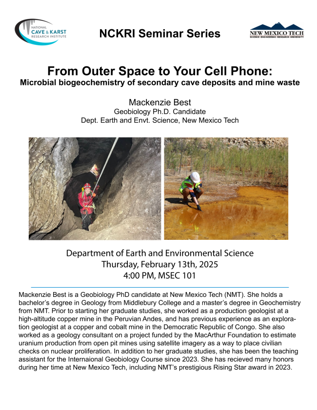Mackenzie Best is a Ph.D. candidate in Geobiology at New Mexico Tech. In February, she gave a presentation on her dissertation research as part of the NCKRI seminar series. Her talk was titled "From outer space to your cell phone: Microbial biogeochemistry of secondary cave deposits and mine waste” (seminar flyer attached). Later in the month, Mackenzie also presented on at the annual Society for Mining, Metallurgy & Exploration (SME) conference and expo in Denver. Her SME talk was titled “High-throughput DNA and RNA sequencing reveals total and active microbial populations associated with critical minerals in historic mine waste, South-central New Mexico."