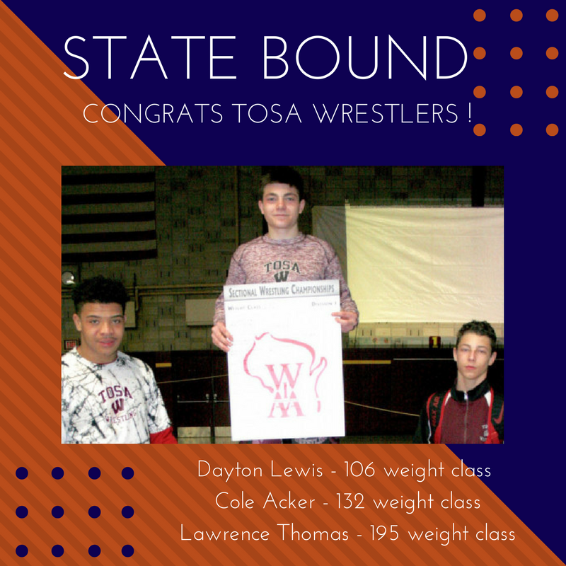 Congrats to East High School freshmen Dayton Lewis, West High School junior Cole Acker, and West High School junior Lawrence Thomas on competing at the state wrestling tournament.