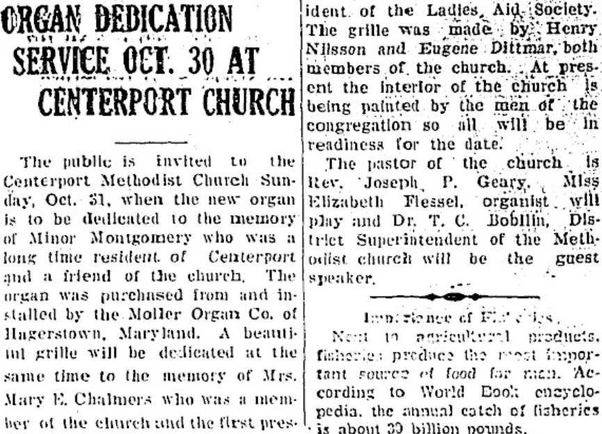 In her honor, a new organ was dedicated to her at the Centerport Methodist Church on October 30, 1948.