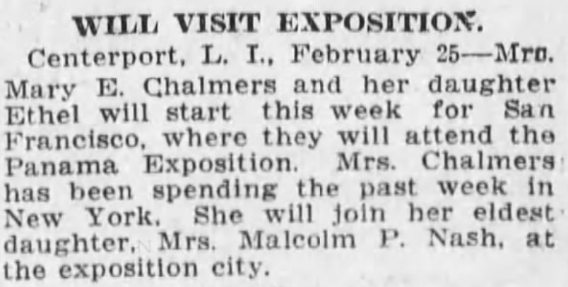 On one particular occasion, according to the Brooklyn Eagle, Mary Emma and her daughter Ethel left for San Francisco in February of 1915 to attend the Panama Exposition to join her eldest daughter, Mrs. Malcolm P. Nash.