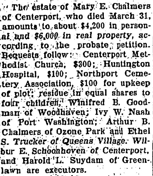 Mary Emma was a member of the Centerport Methodist Church and the first president of the Ladies Aid Society. According to local newspapers, it seems that Mary Emma enjoyed traveling, always visiting family or friends around Long Island.