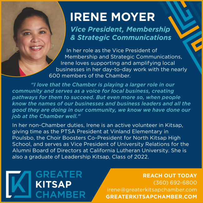 Renew your membership today to ensure your place as a Charter Member of the Greater Kitsap Chamber! Questions about when to renew or how to upgrade your membership? Contact Irene now!