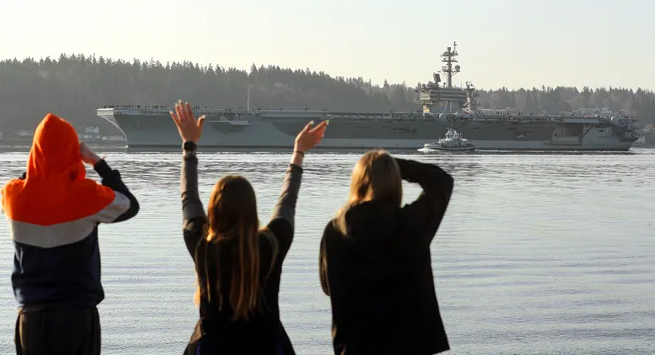 Photo: Family and friends of the sailors aboard the USS Theodore Roosevelt (CVN-71) wave from the Shore of Bachman Park in Bremerton, WA, as the aircraft carrier departs Puget Sound Naval Shipyard after its 18-month overhaul, on Friday, March 17, 2023. MEEGAN M. REID/KITSAP SUN