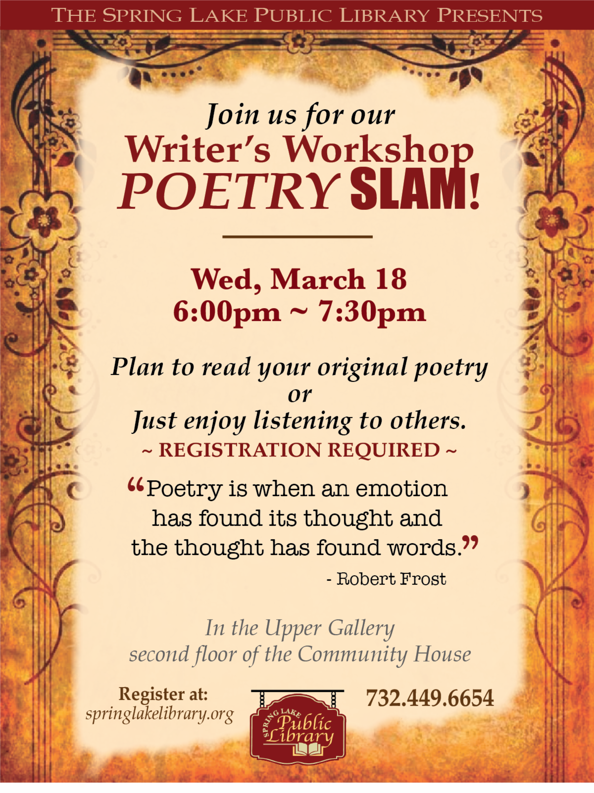 • Poetry SLAM- participate by reading or just enjoy the evening listening