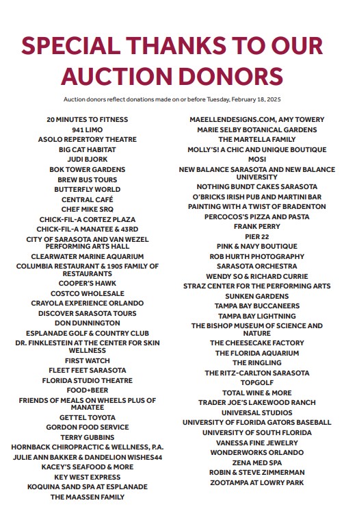 The sellout crowd on Saturday, March 1, 2025, shopped, ate, drank, danced, and donated in support of our lifesaving mission! It was a fantastic evening to raise important resources for our PLUS programs: Home-delivered Meals, The Food Bank of Manatee, Daybreak Adult Day Center, and Friendship Dining Centers.