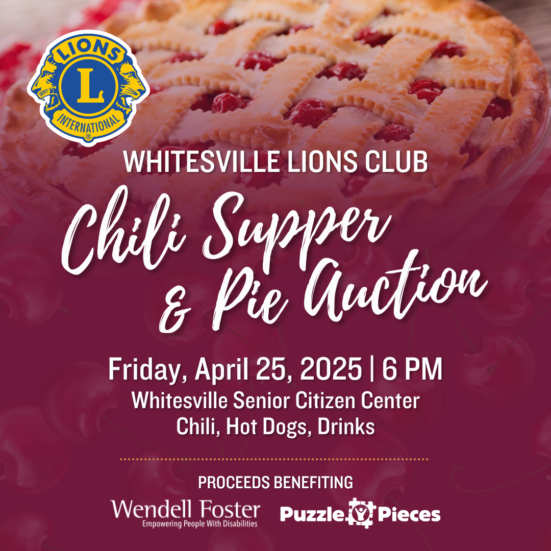 The Whitesville Lions Club Chili Supper & Pie Auction is just a few weeks away! Join us on April 25th at the Whitesville Senior Citizen Center, where the chili is hot, the pies are sweet, and the bidding is fierce! Chili, hot dogs, and drinks will be served at 5 pm, with the Pie Auction starting at 6 pm. If you are interested in donating a pie or other desserts, baked goods can be dropped off at the Senior Citizen Center before 4 pm on the day of the Pie Auction. We hope you'll come hungry and ready to raise some dough π₯§ for Wendell Foster and Puzzle Pieces!