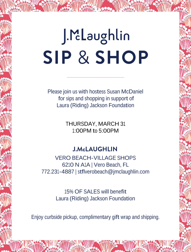 A portion of every purchase made at J. McLaughlin in the Village Shops of Vero Beach on March 31, 2022 will go benefit the Laura Riding Jackson Foundation.