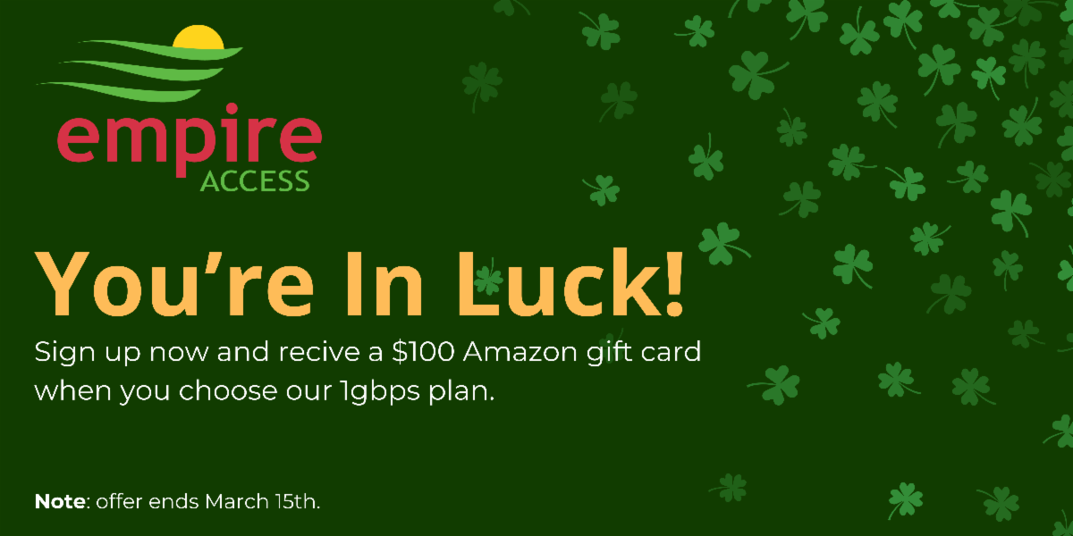 To make your decision even easier, we’re excited to present you with a $100 Amazon Gift Card when you sign up for our internet service! This exclusive offer is our way of saying thank you for choosing Empire Access.